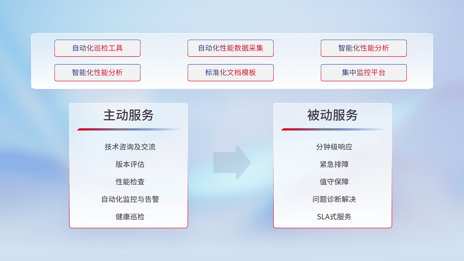 智能化工具和标准化文档,,,,保障服务质量,,,提供主动服务(包含技术咨询、、版本评估、、性能检查、、、、自动化监控与告警、、健康巡检)和被动服务包含(分钟级响应、、、紧急排障、、、、值守保障、、、、问题诊断解决、、SLA服务)。。。