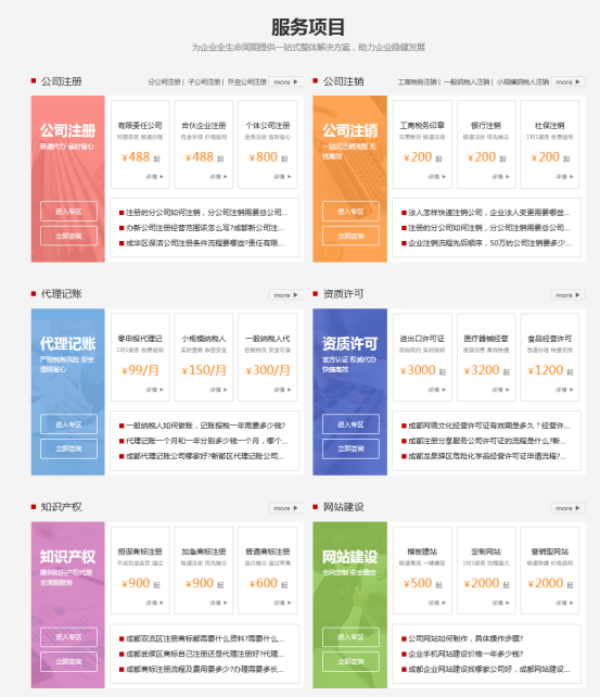 成功起点企业创业服务平台此次改版重设服务项目板块,,整体划分为公司注册、、、、公司注销、、、代理记账、、、资质许可、、知识产权、、网站建设6大内容,,,包含数十项细分服务项目,,可充分满足企业全生命发展周期中的业务需求;其次每项服务明码标价,,,旨在为客户提供最真实、、、最透明的项目价格体系,,整体提升客户体验与感知。。。。