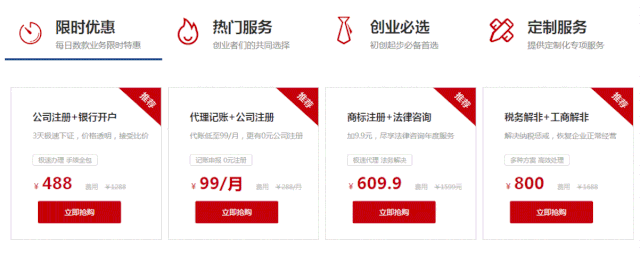 限时优惠:数款核心业务限时特惠,,,业务项目定时更换,,,满足企业全方位服务需求。。。。